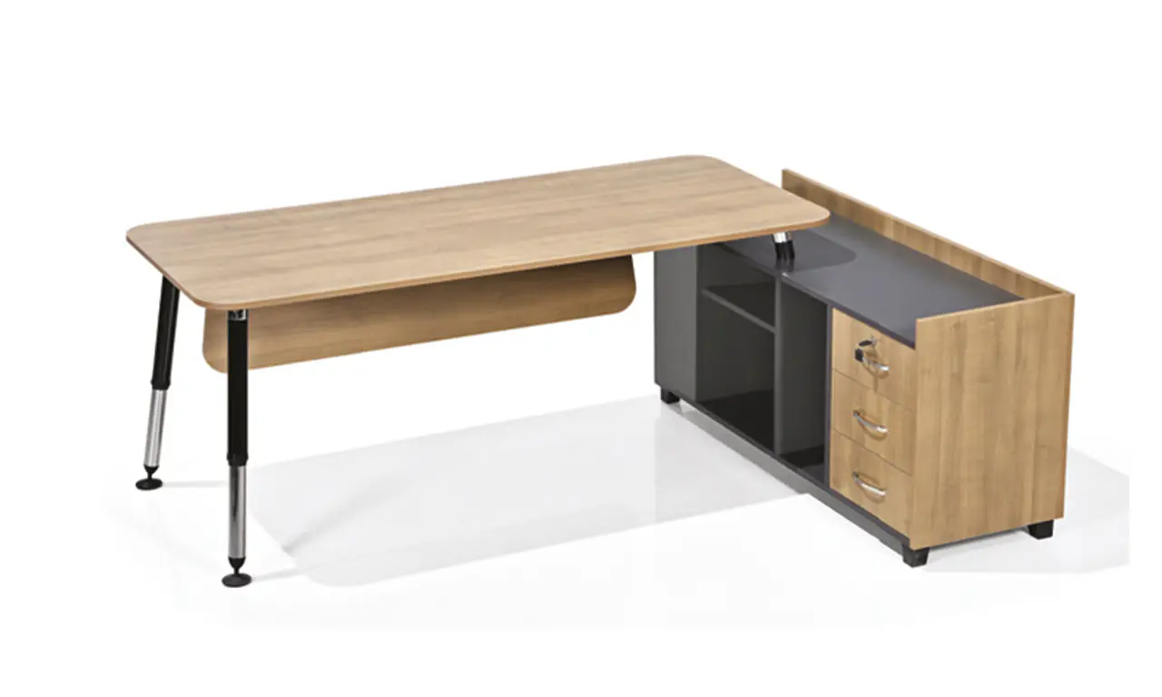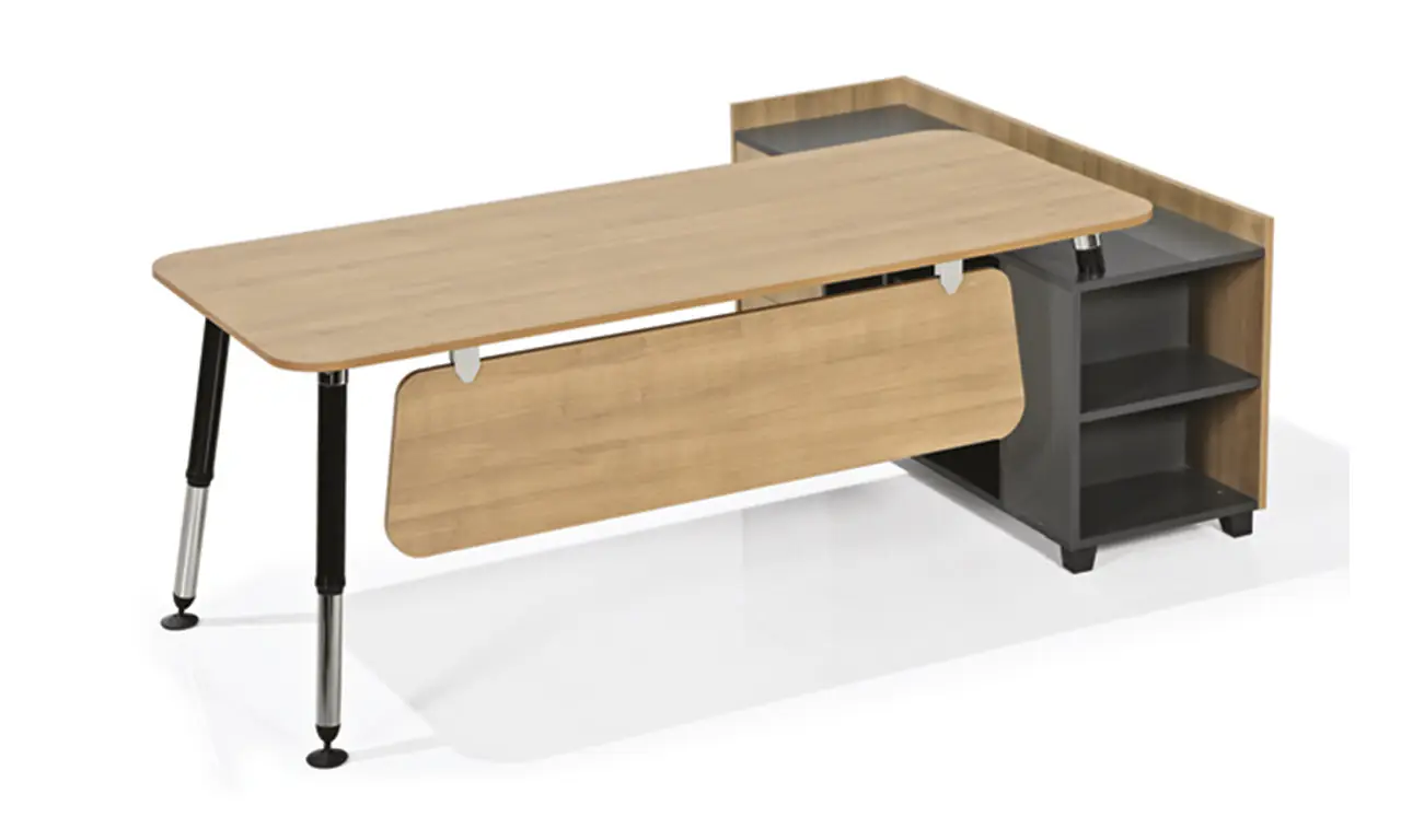 BRLE-160150 (Droite) BERIL-ETA Table 18 mm Plateau en mélamine Table 18 mm Rideau avant Étagère à trois tiroirs Peint électrostatiquement, chromé Pied en métal spécial L : 160