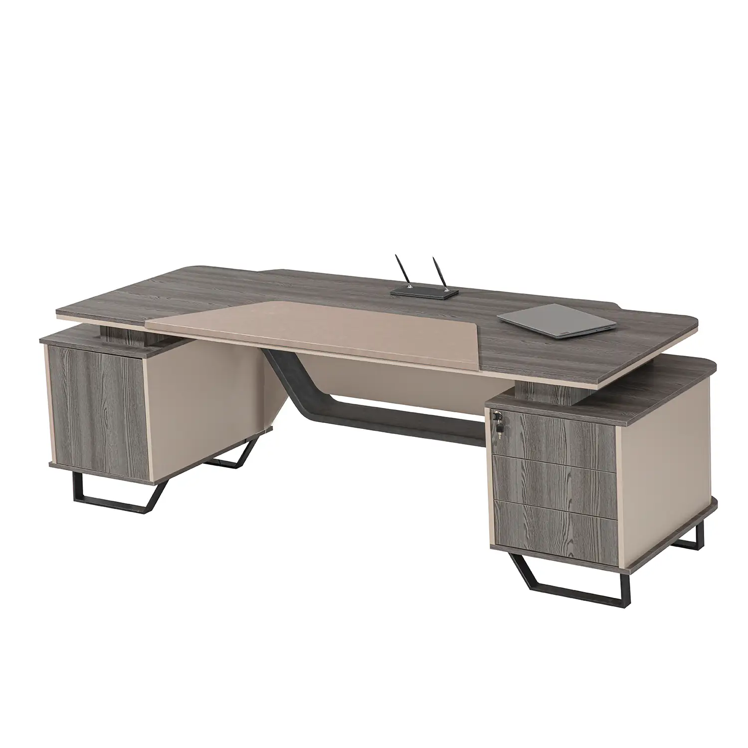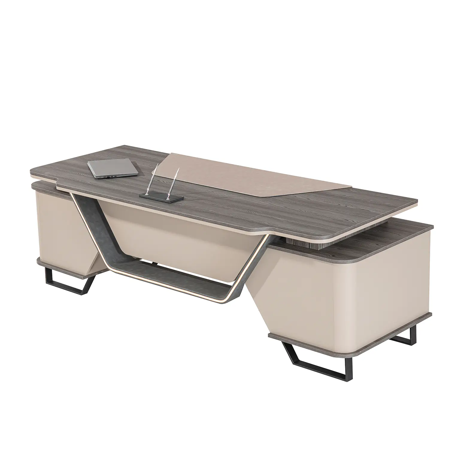 2024M-24090 modeli, geniş çalışma alanı sunan bir masa olarak dikkat çeker. 18+8 mm kalınlığındaki Myl deri kaplamalı üst tabla, sağlam ve şık bir görünüm sunar. LED’li ön perde detayı ile modern bir atmosfer oluşturur. Ayrıca masa altı 3 çekmeceli komodin ve dolap ile depolama ihtiyaçlarınızı karşılar.